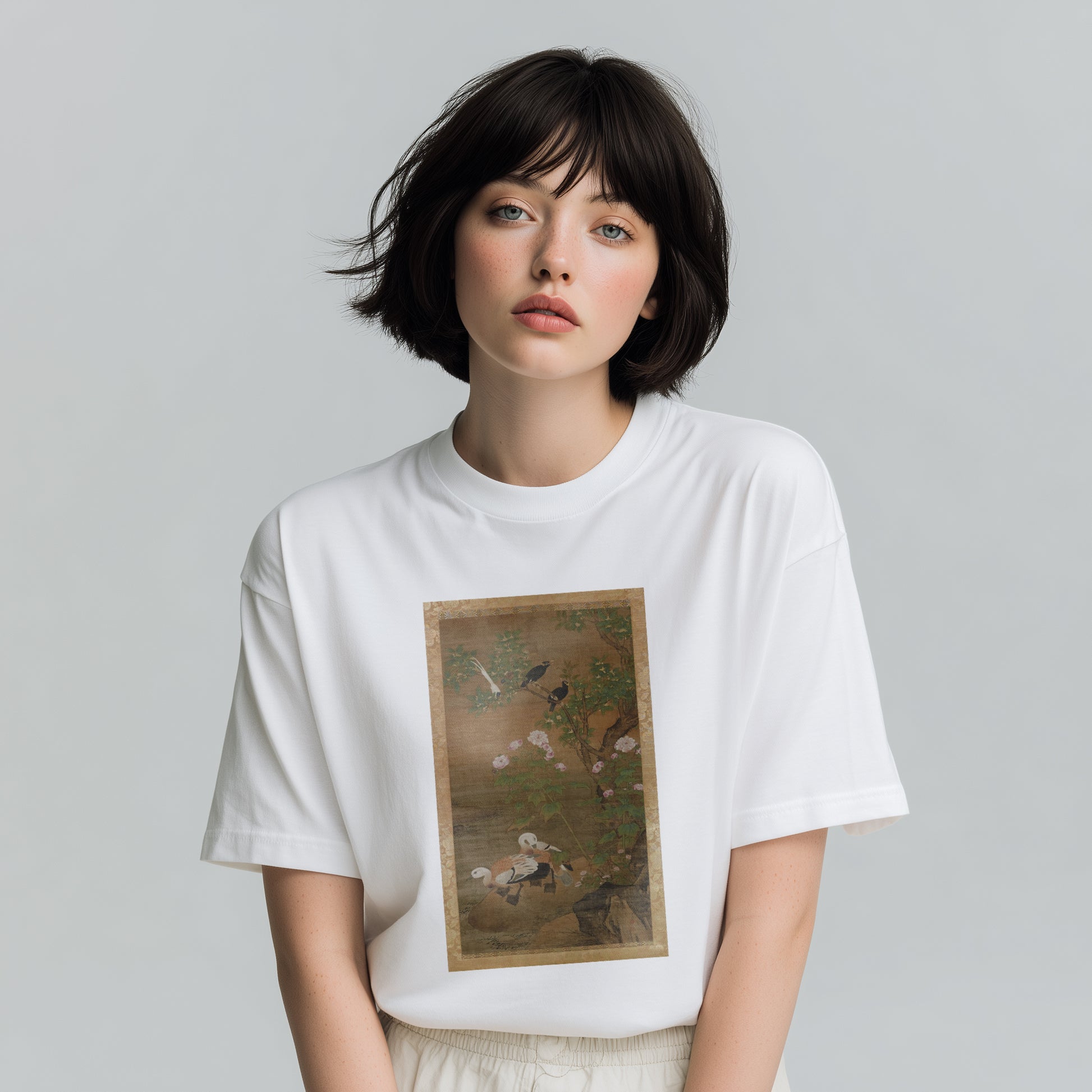 This work represents "Winter" from a four-panel series themed on the four seasons. A boldly rendered meandering waterfall flows through the scene, with plum and camellia blossoms in bloom. Sparrows and a male and female pheasant huddle together, as if seeking warmth. Considered Lü Ji’s greatest masterpiece, it also influenced Japanese art from the Muromachi period onward.