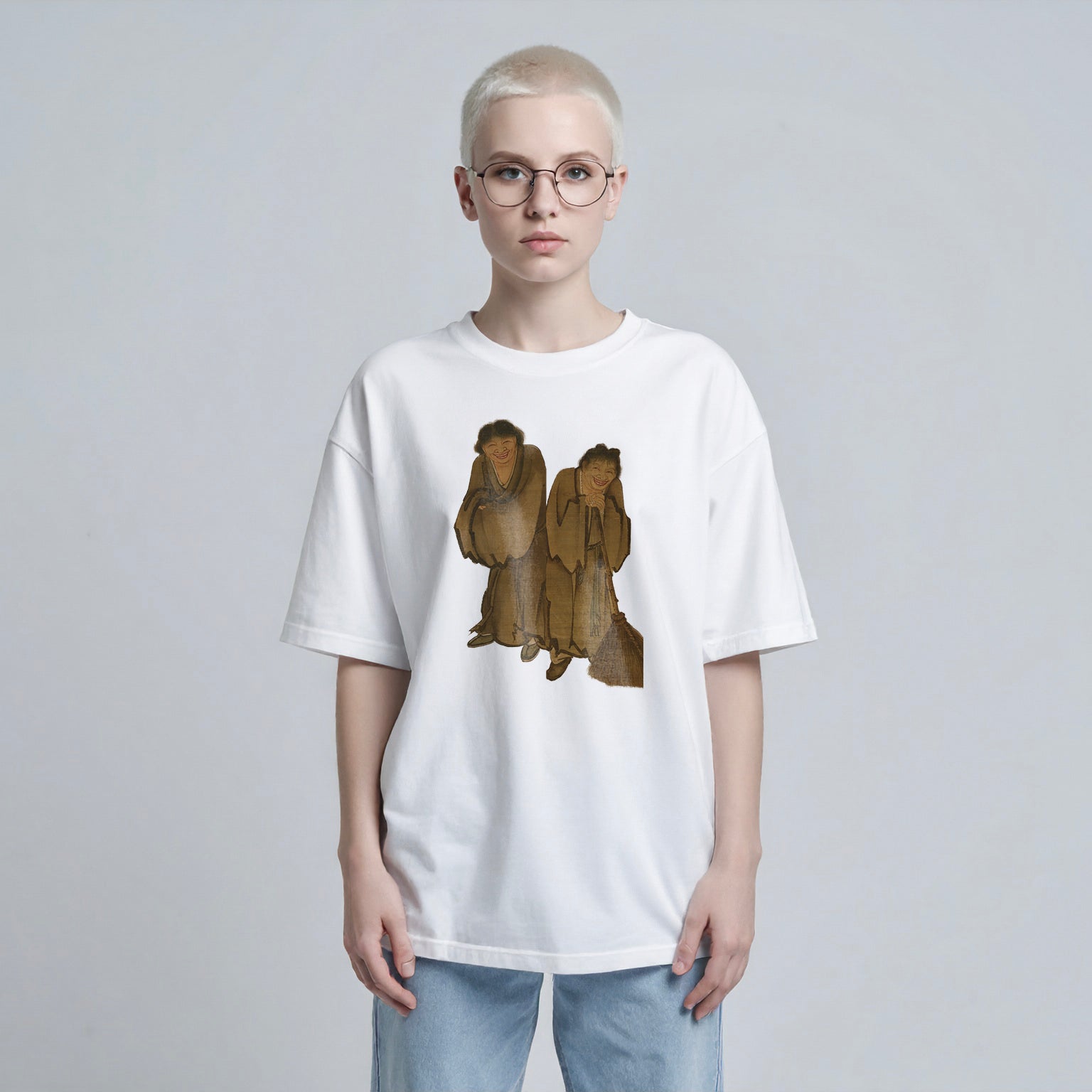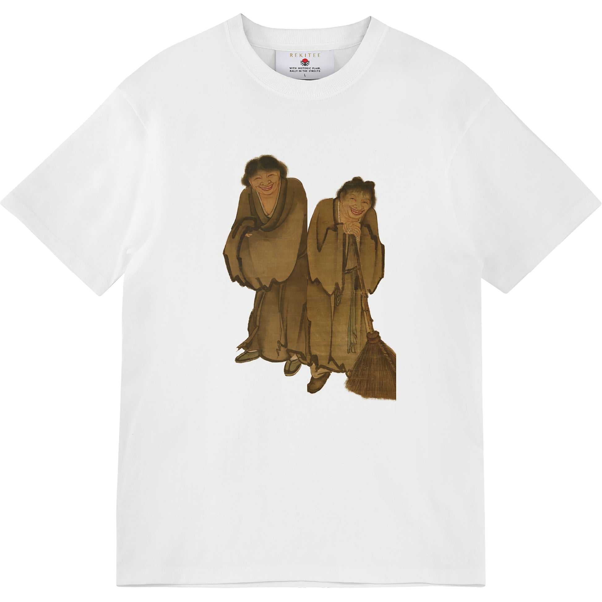 Hanshan and Shide were poet-monks of the Tang dynasty, known for their eccentric behavior as symbols of spiritual enlightenment. Zen painters favored them as subjects, with Hanshan often holding a scroll and Shide a broom. Their humorous appearance is memorable, and they are regarded as incarnations of Manjushri and Samantabhadra.