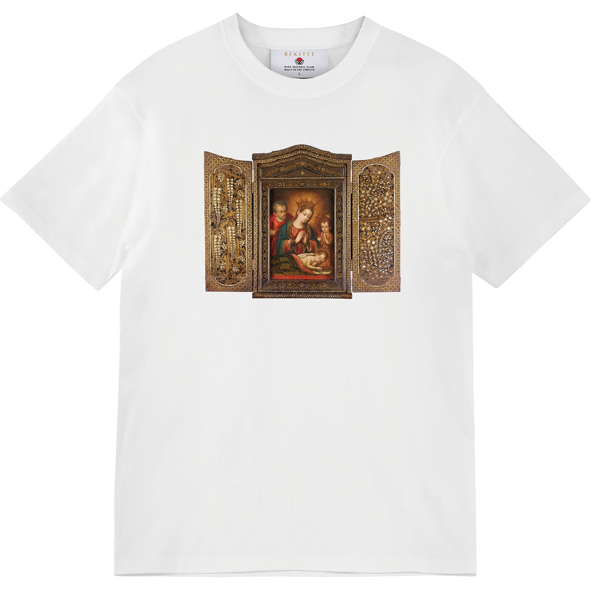 This 16th-century lacquerware piece, made for church rituals, belongs to the genre known as "Namban lacquerware," produced in Japan for export to Europe. Designed as a slender shrine, it uniquely blends Western aesthetics with traditional Japanese techniques, such as "maki-e" and mother-of-pearl inlay. At its center is a copperplate oil painting imported from Europe, depicting Mary, Christ, Joseph, and John.
