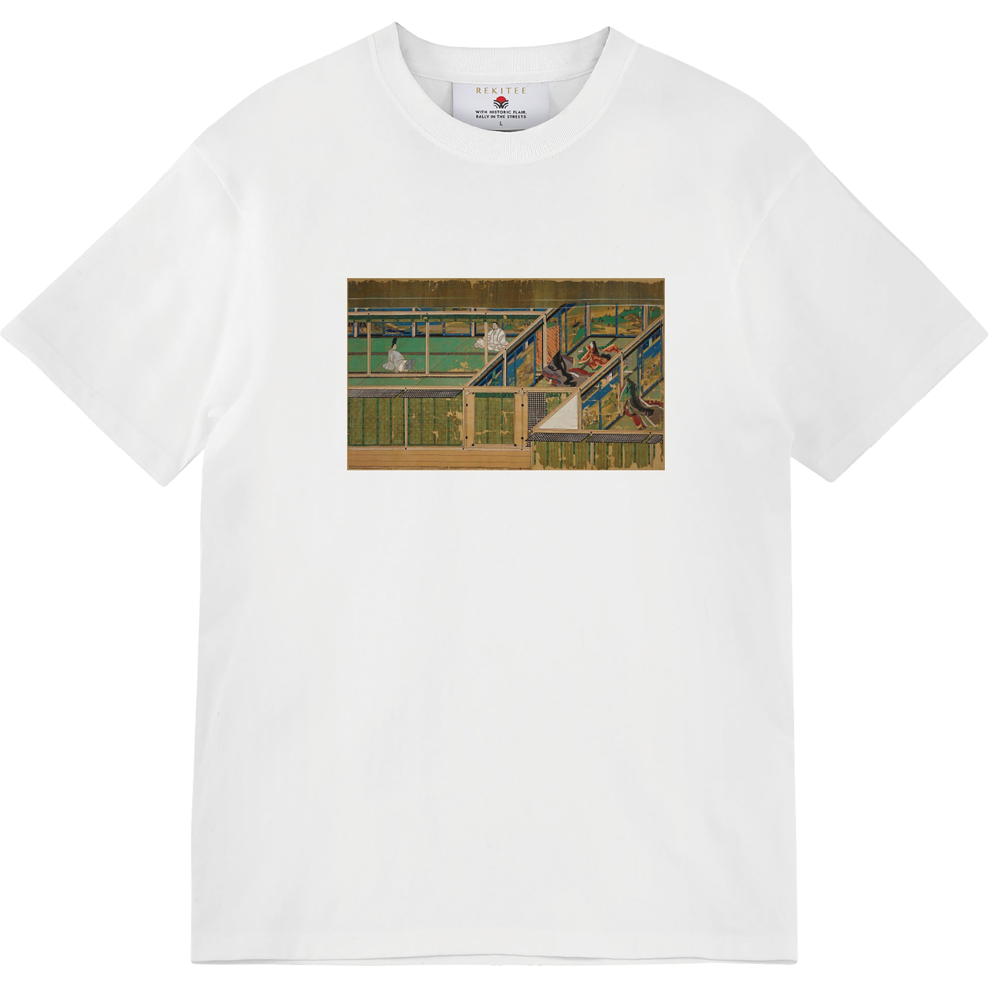 This illustrated scroll depicts the miraculous legends of Kasuga Gongen, the guardian deity of the Fujiwara clan, created in gratitude for their prosperity and hopes for continued success. The scene shows Fujiwara no Tadazane seated with his father-in-law, Minamoto no Toshifusa. Painted on delicate silk, it has survived for over 700 years in near-perfect condition, and its intricate details give it high historical value.